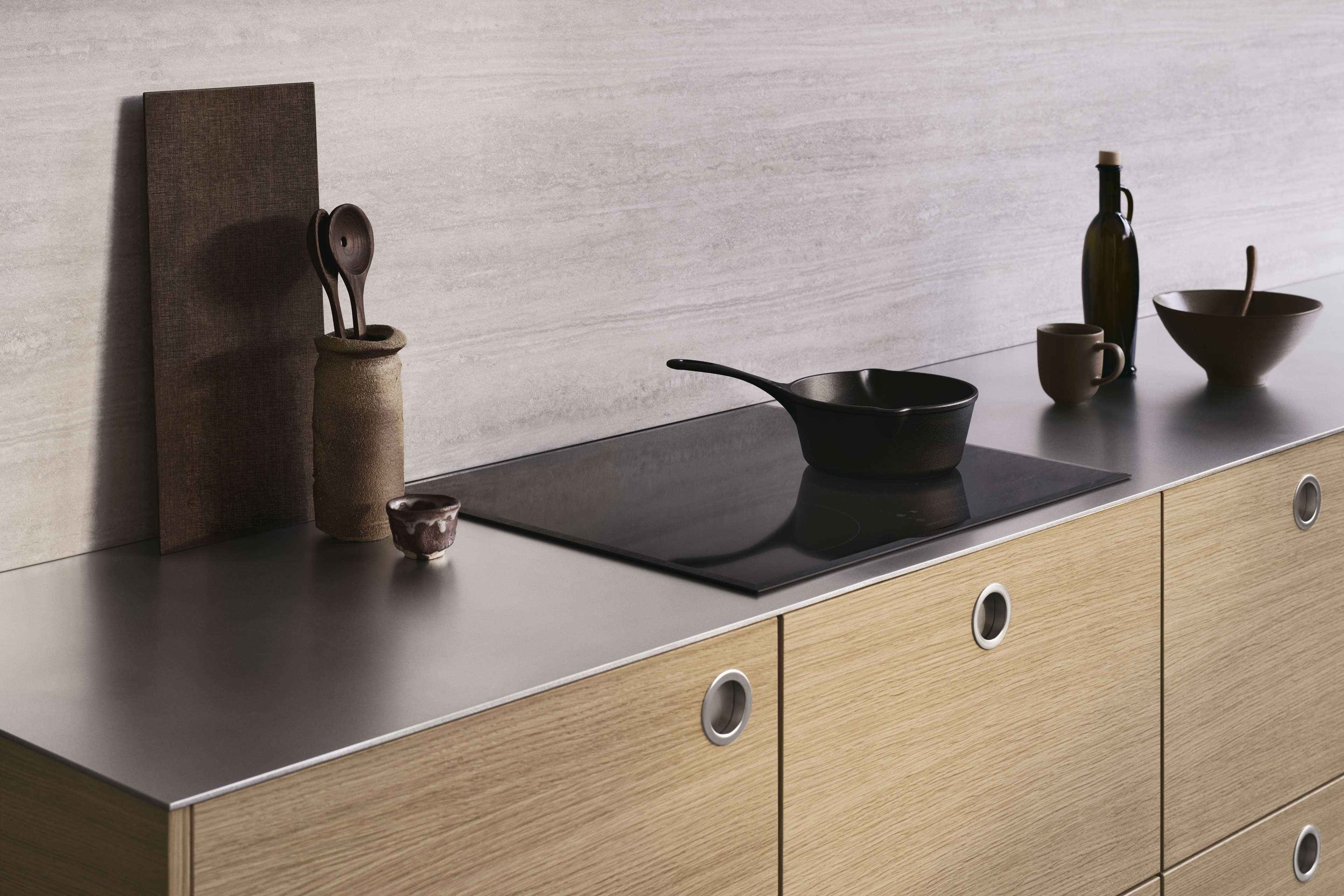 Bordo hat ultramatte Oberflächen aus recyceltem PET mit Anti-Fingerprint-Technologie. Diese Oberflächen sind langlebiger als lackierte Fronten und machen den täglichen Gebrauch zu einem ästhetischen und funktionalen Erlebnis. Etwas verschüttetes Mehl oder eine Tür, die mit nassen Händen geöffnet wurde? Solche Spuren lassen sich künftig mühelos beseitigen.